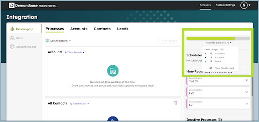 In Data Integrity, the number of records you can sync to your CRM depends on the credits allocated to your Demandbase account. You can see your credit balance in the Data Integrity credit status bar.